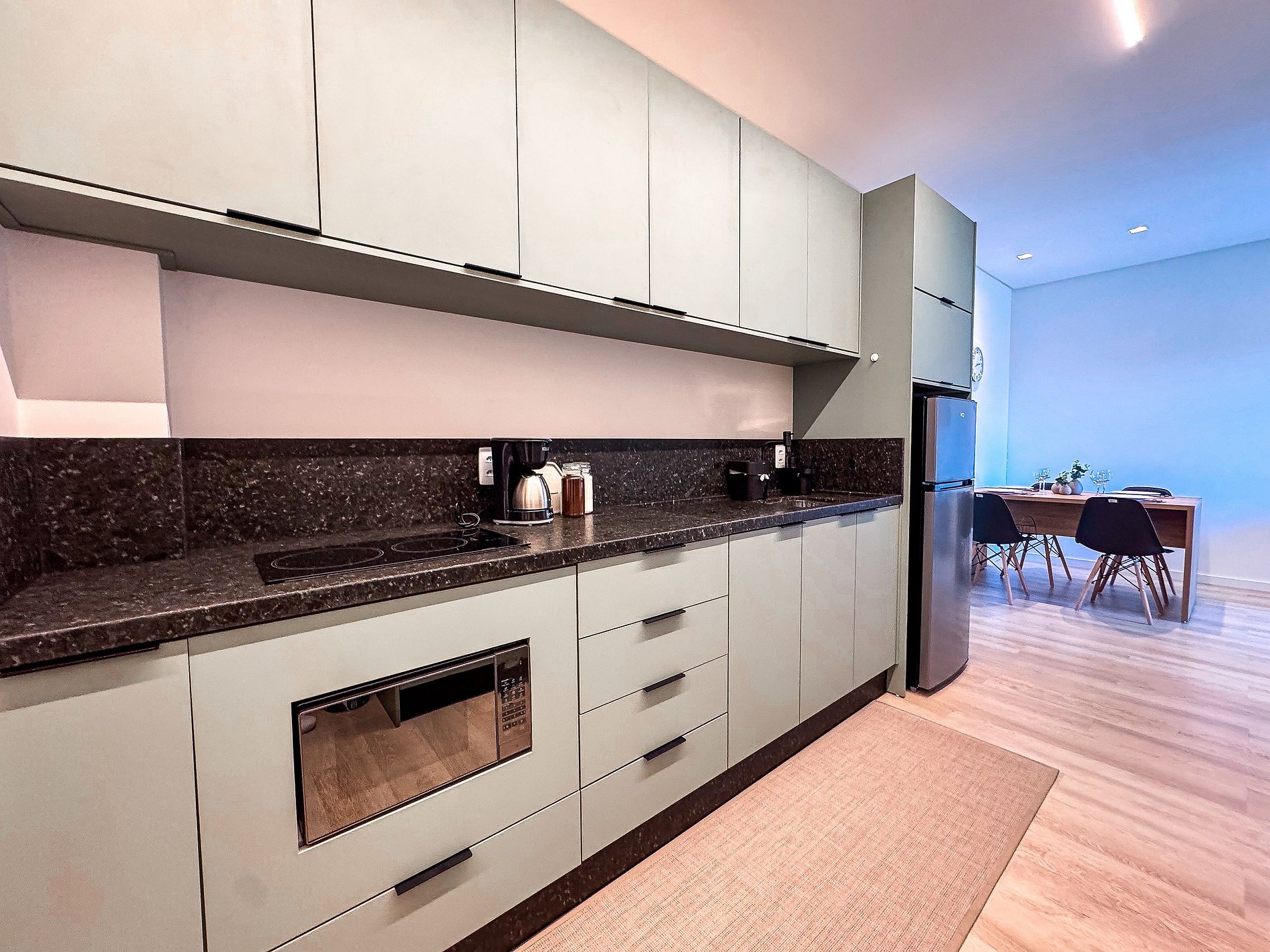 - Cozinha completa e moderna, equipada com utensílios, geladeira e mesa de jantar pronta para bons momentos