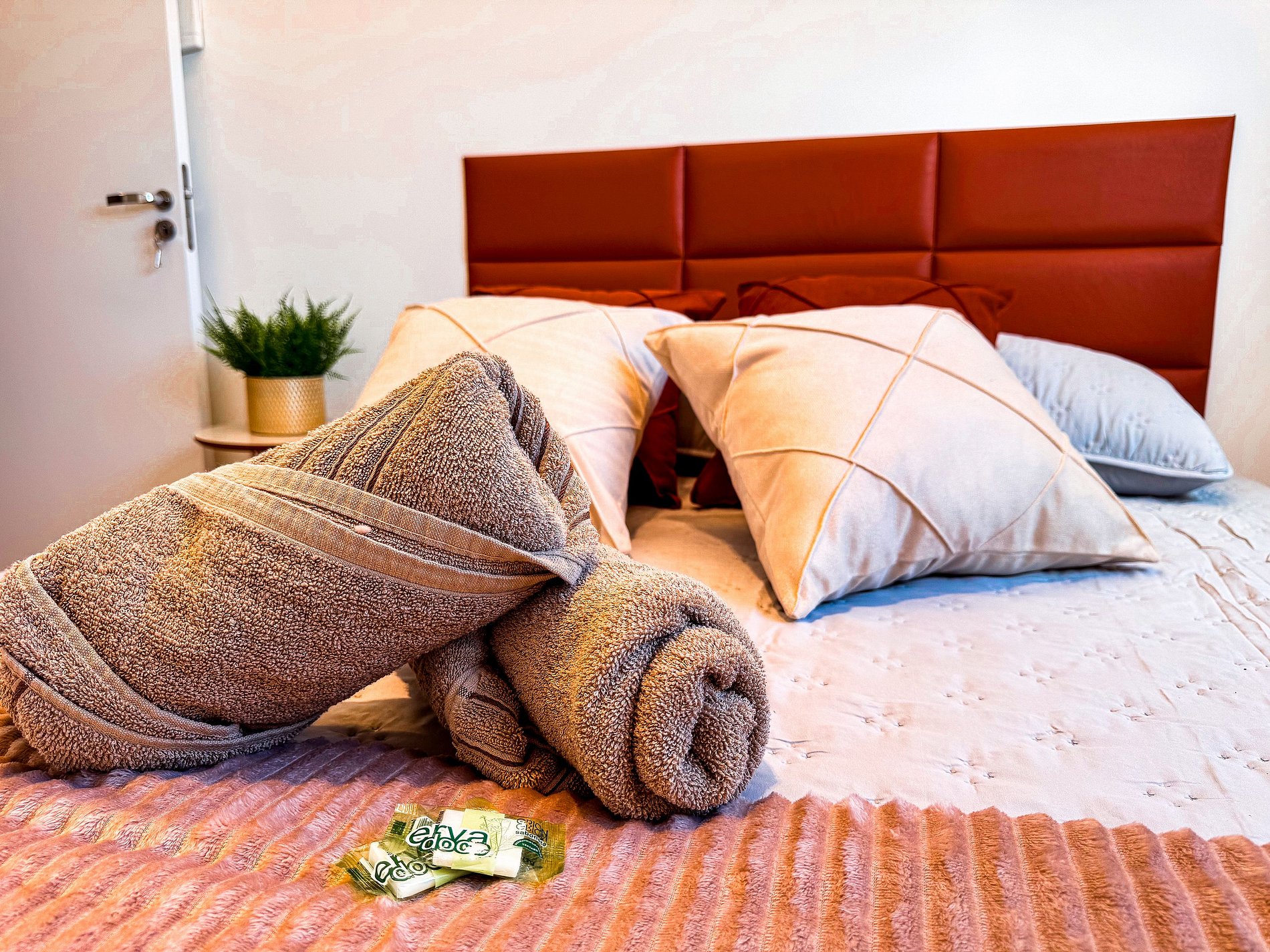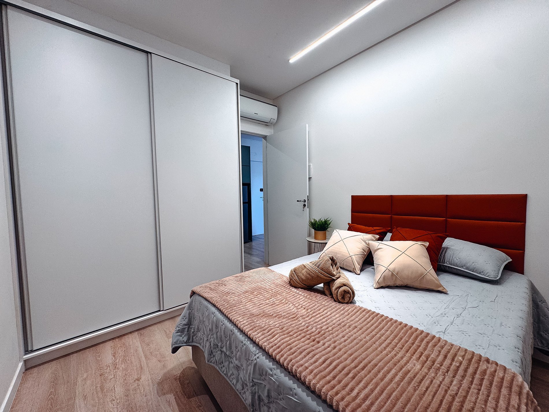 - Quarto confortável, com cama macia, enxoval completo e ar condicionado.