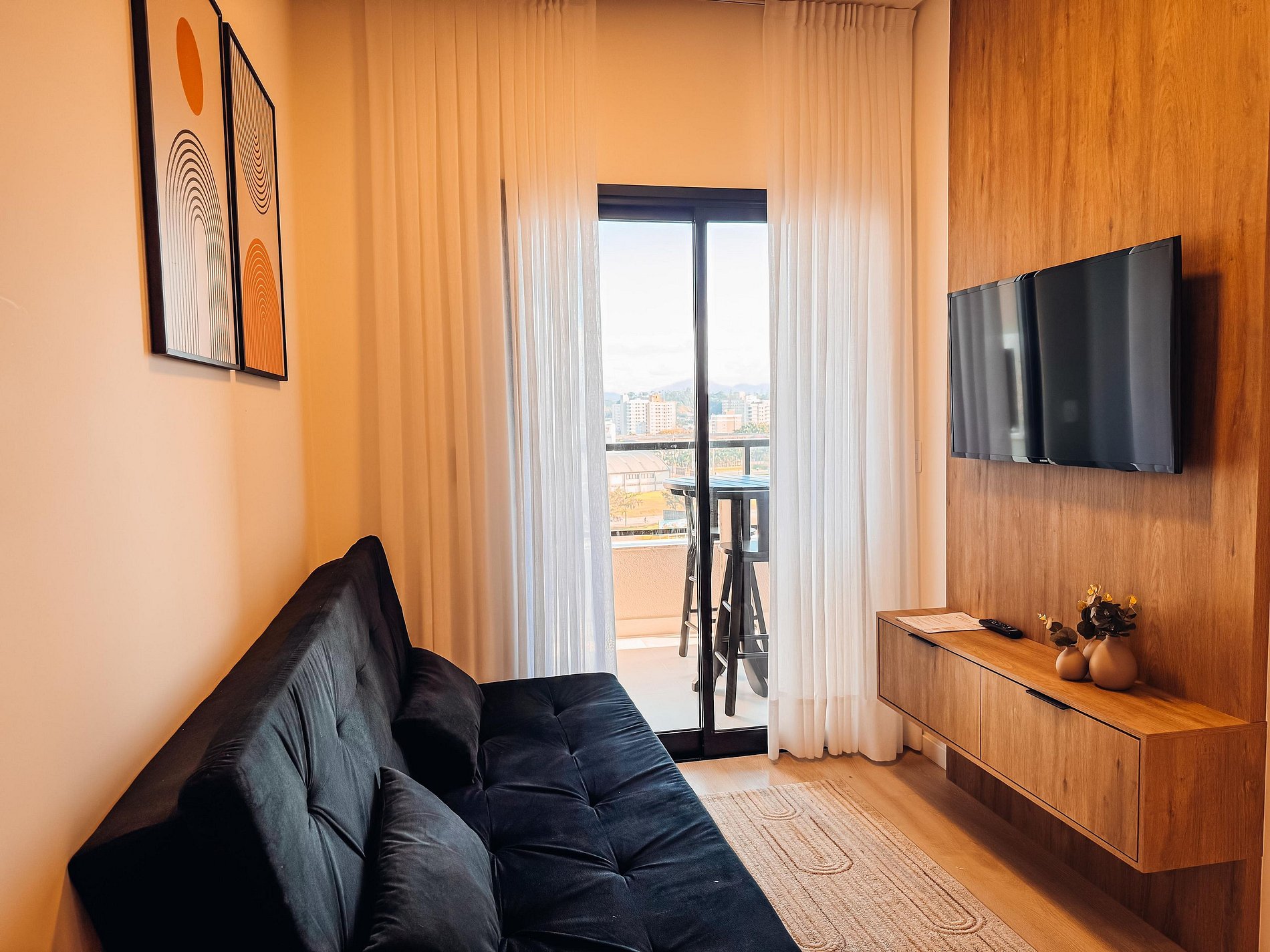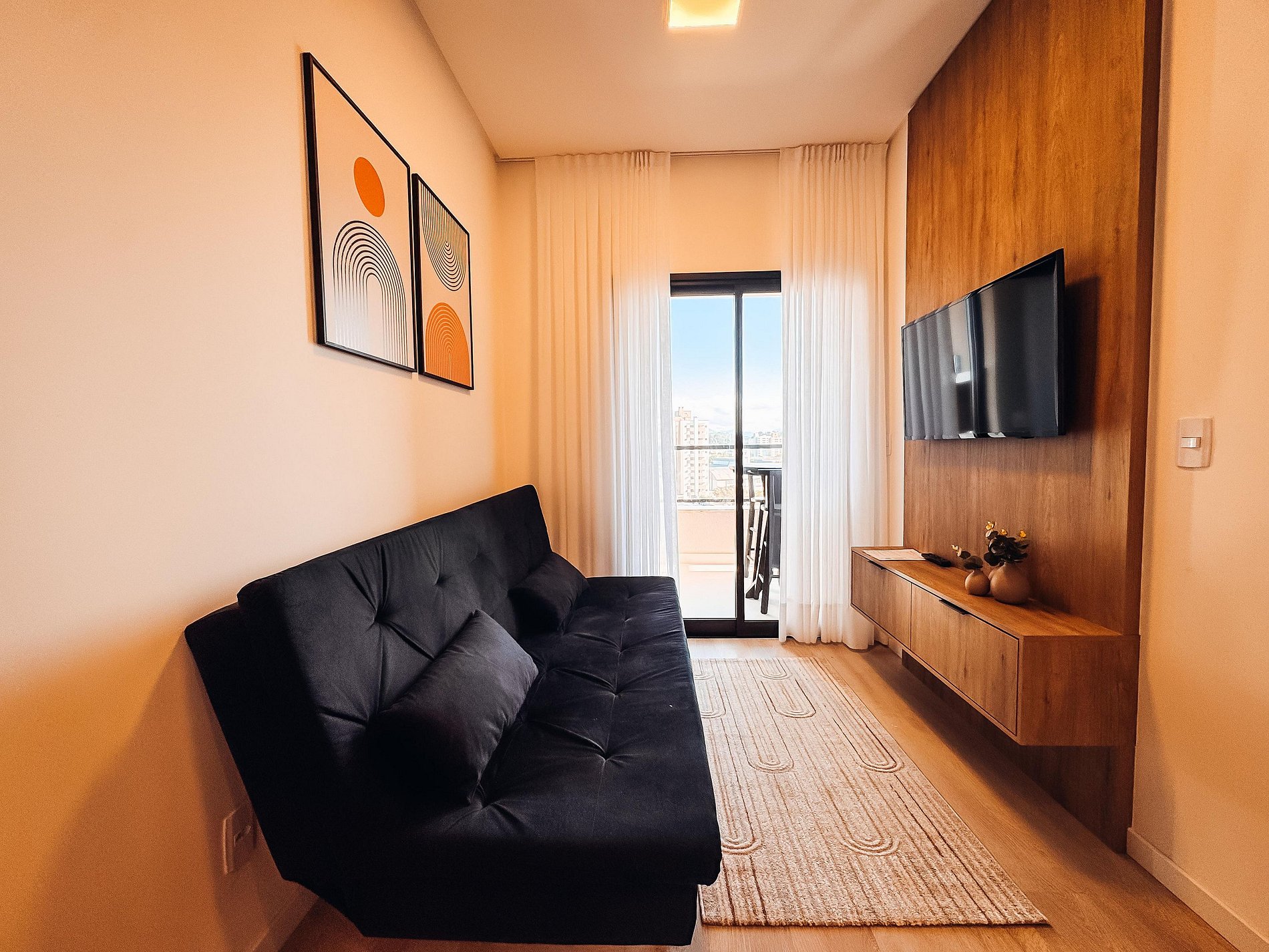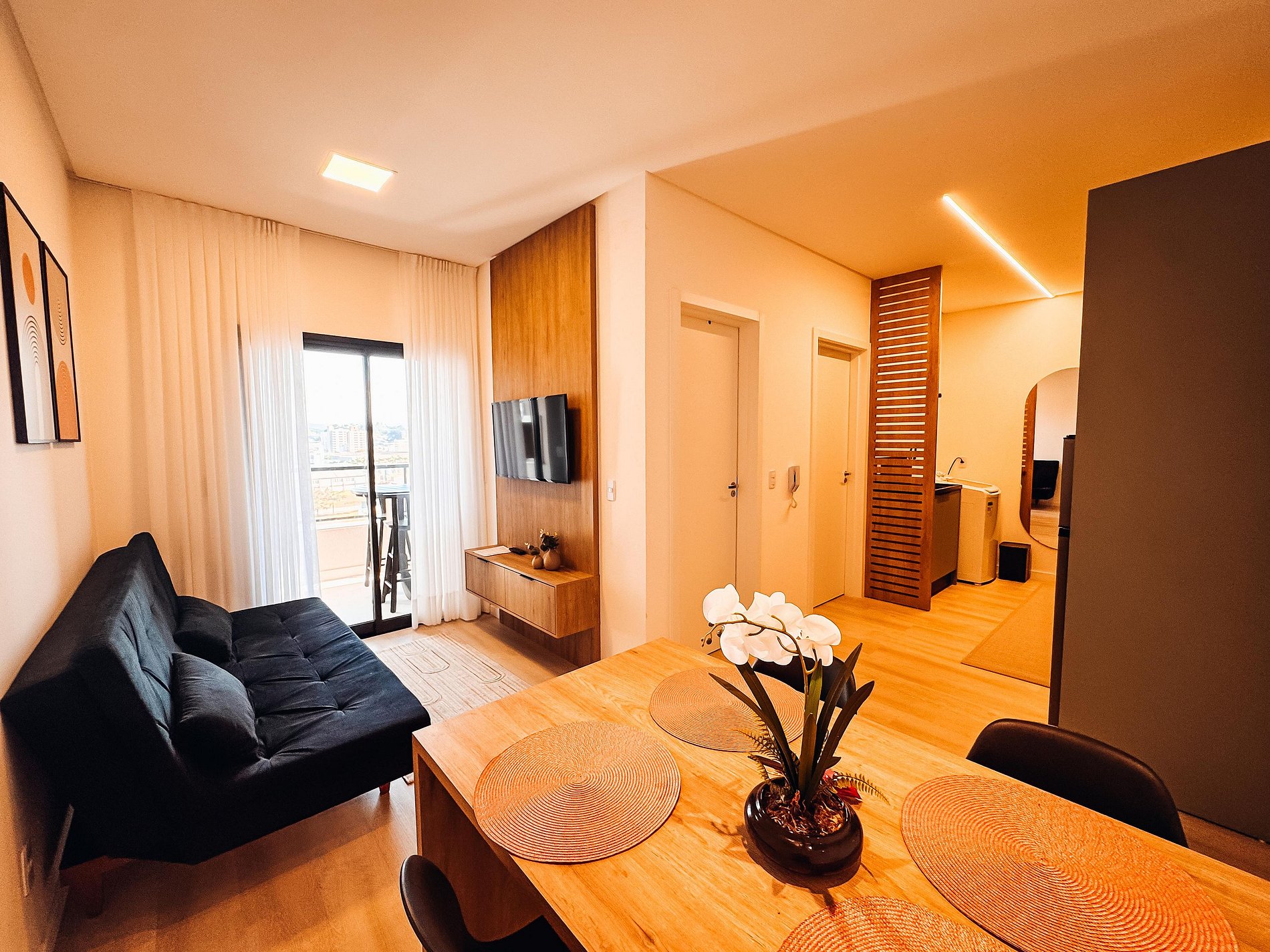 - Sala integrada, com TV (Dispões de apps de streamings, o hospede deverá logar conta pessoal), sofá cama e um toque de design que deixam o ambiente super agradável