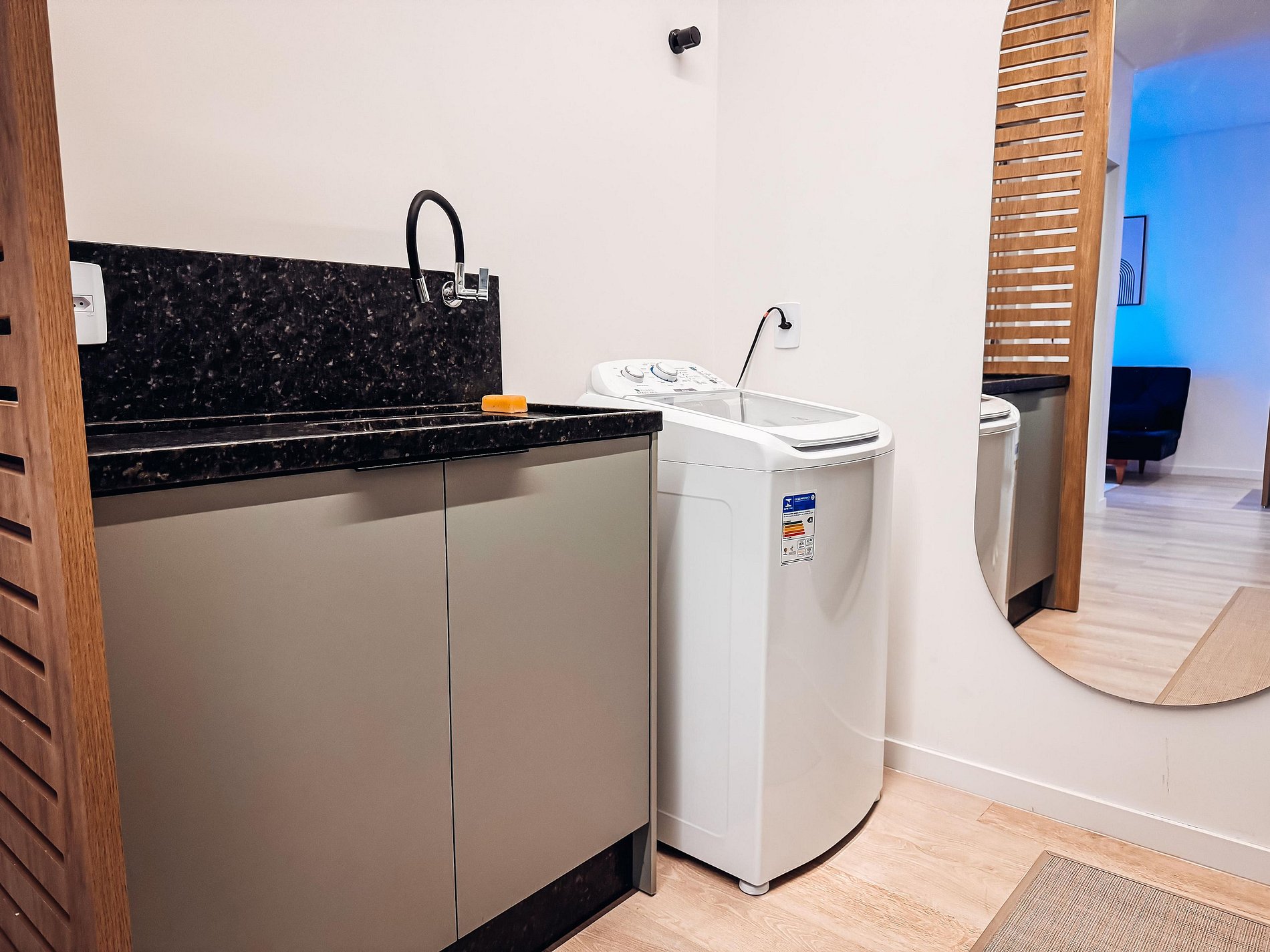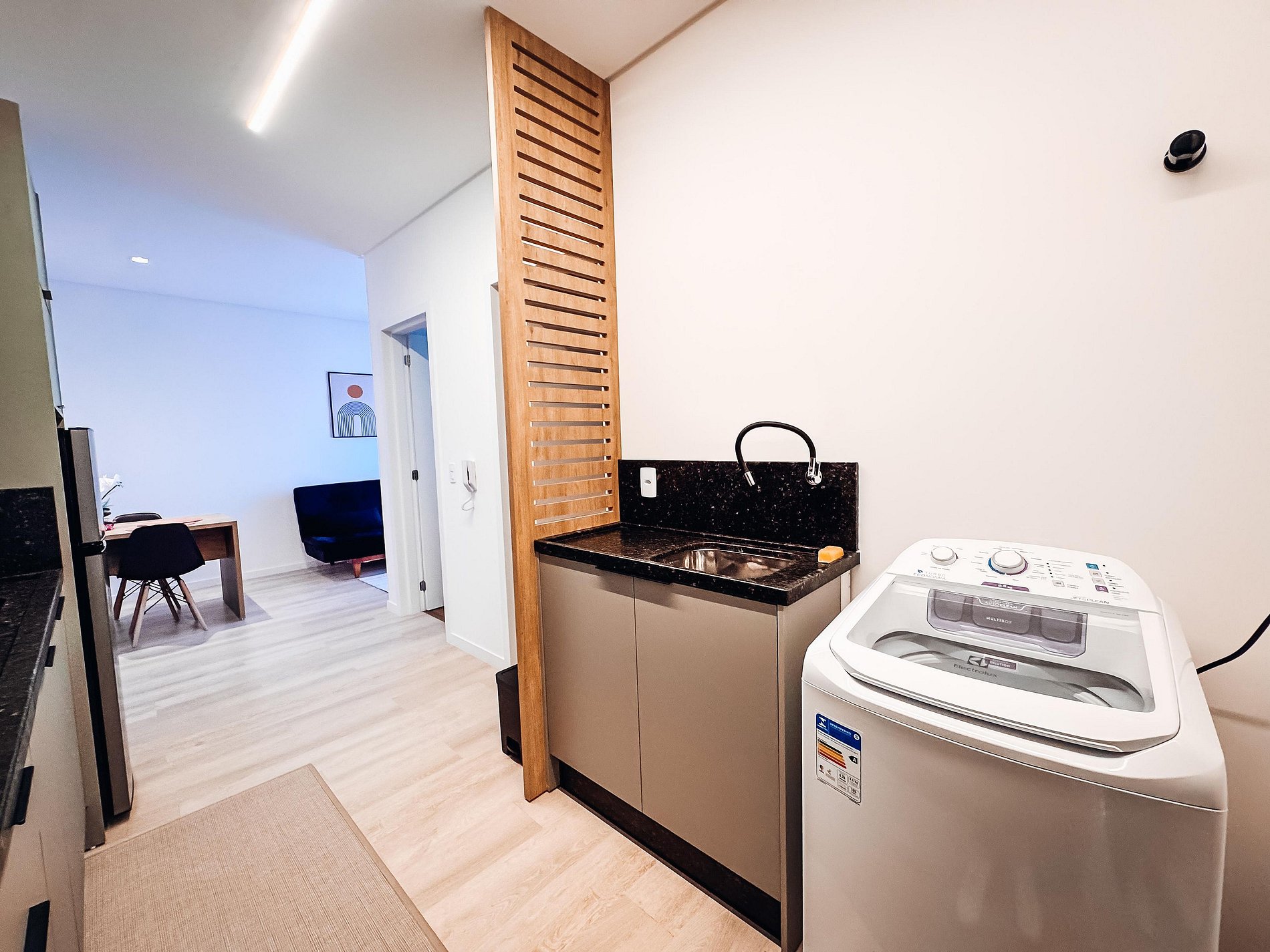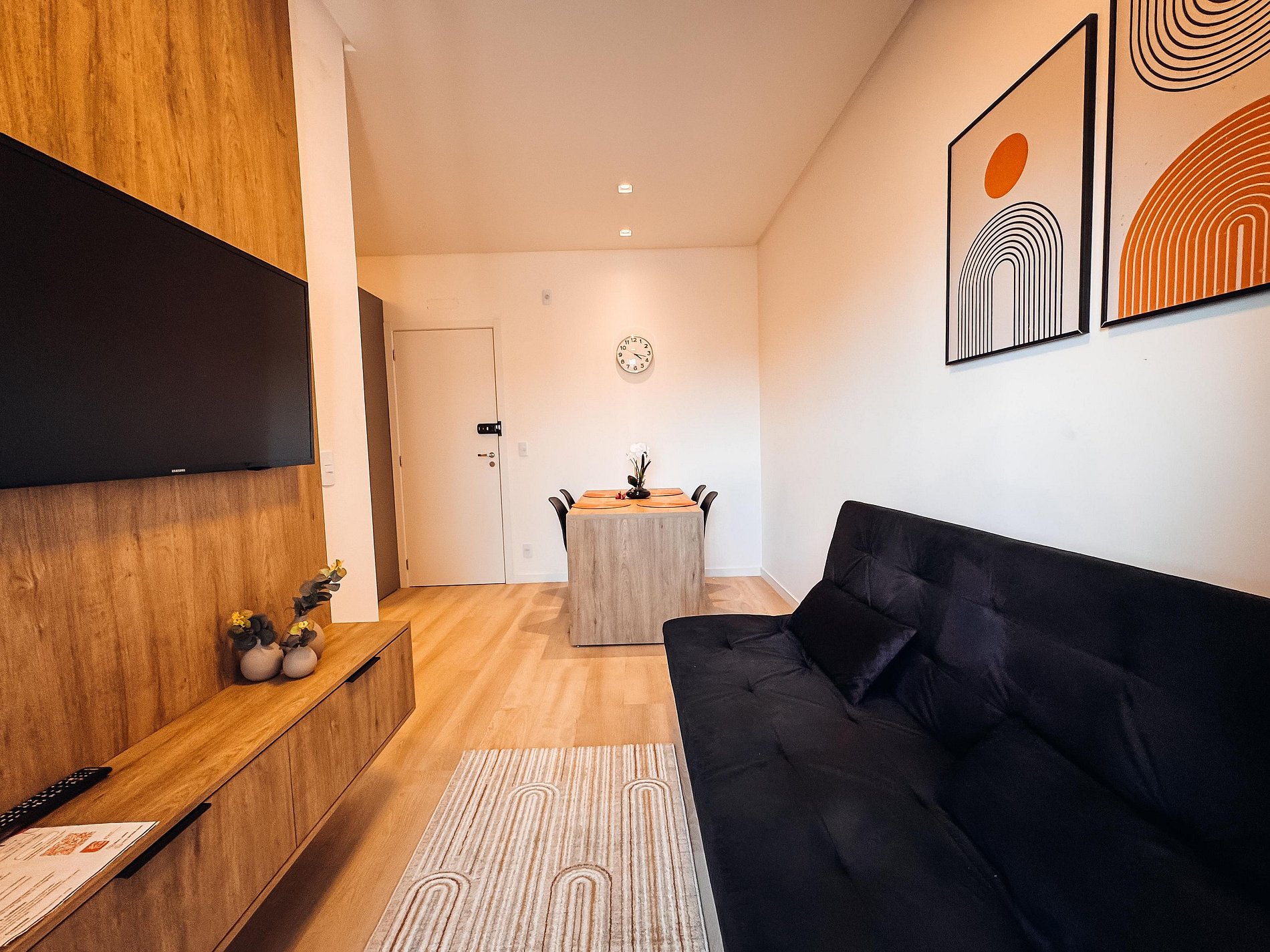 - Sala integrada, com TV (Dispões de apps de streamings, o hospede deverá logar conta pessoal), sofá cama e um toque de design que deixam o ambiente super agradável