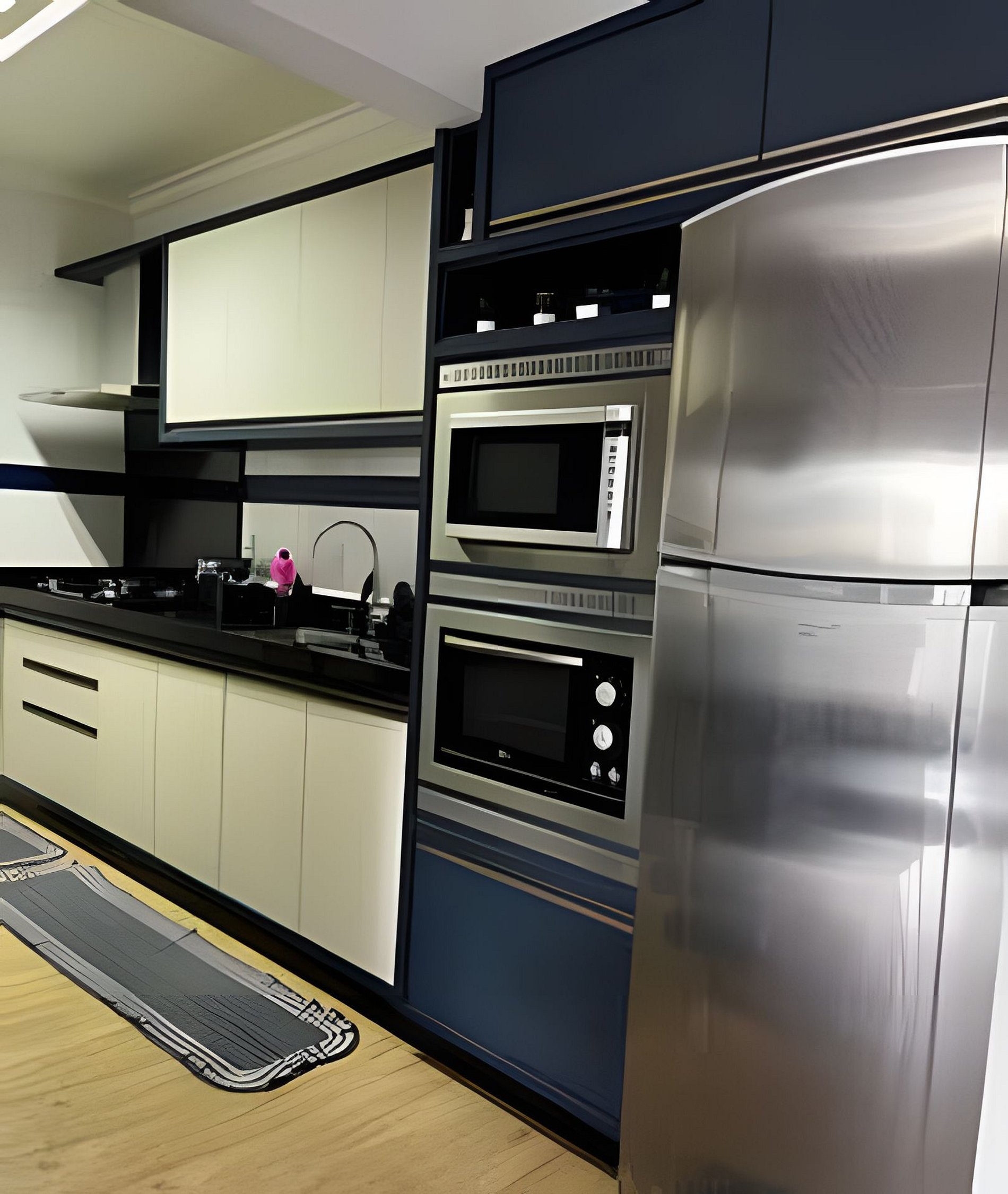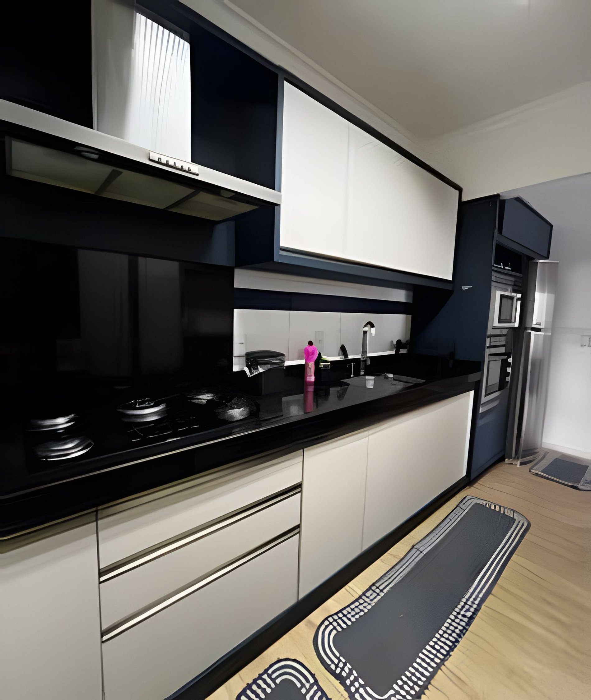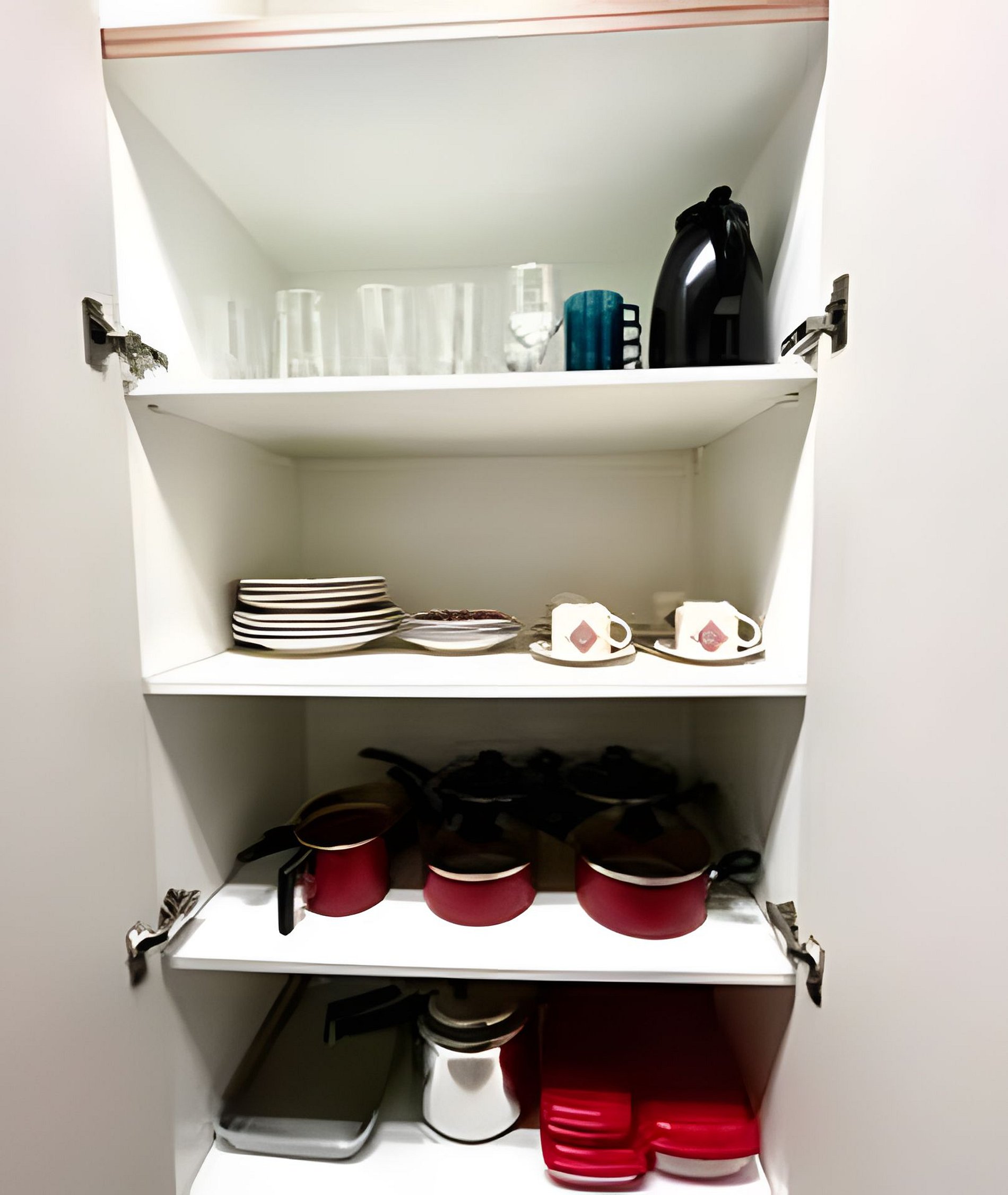 Cozinha completa: equipada com utensílios, panelas, micro-ondas, cooktop e geladeira — tudo o que você precisa para preparar suas refeições.