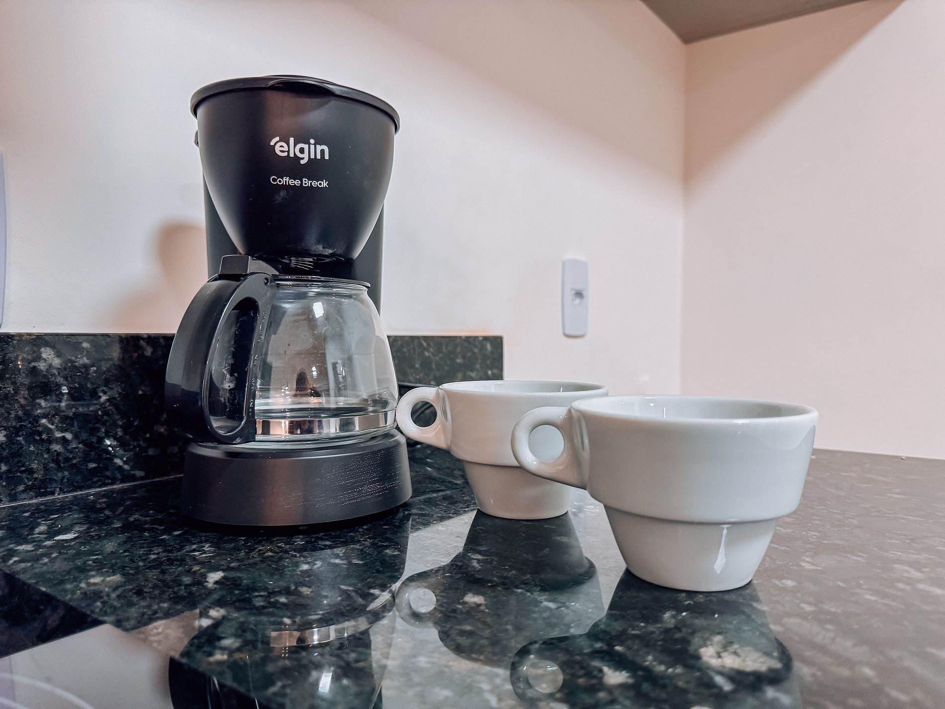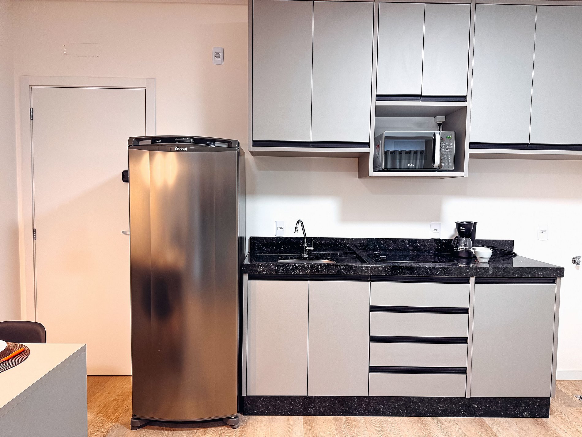 A cozinha integrada está equipada para o preparo de suas refeições, contando com geladeira, micro-ondas, fogão e utensílios de cozinha. Um dos grandes diferenciais é a sacada com churrasqueira, perfeita para relaxar e aproveitar.