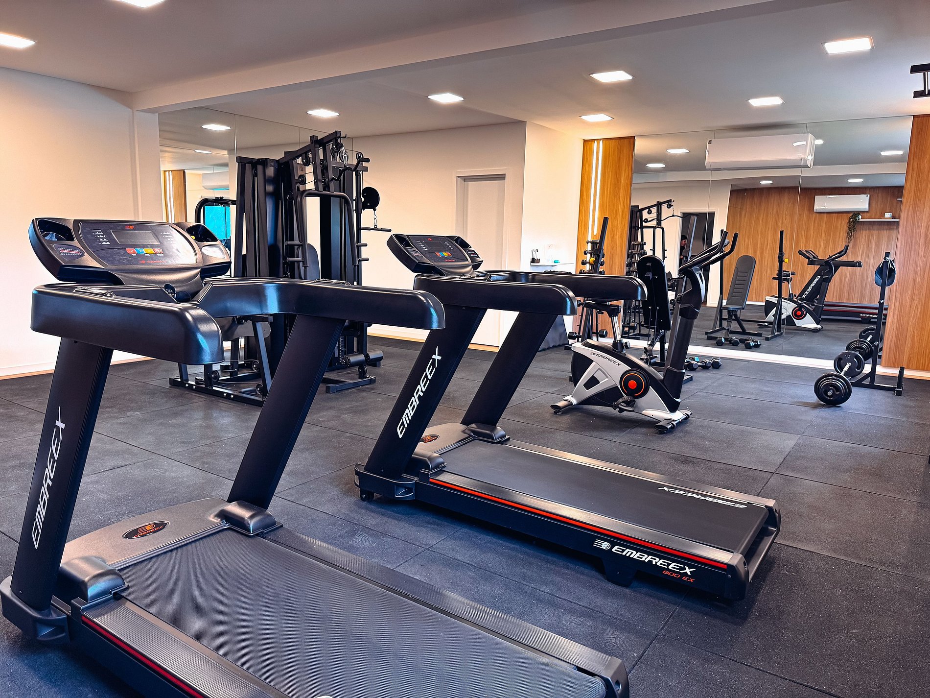 Durante sua estadia, você também tem acesso livre à academia do condomínio, podendo manter sua rotina de exercícios.