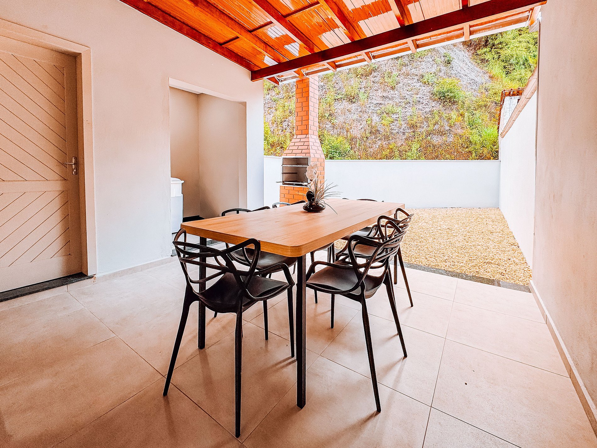 Acesso aos fundos com varanda privativa, churrasqueira e mesa com 6 cadeiras, perfeita para momentos de lazer