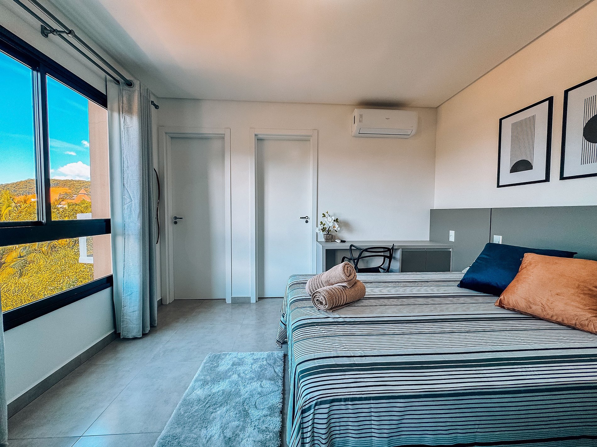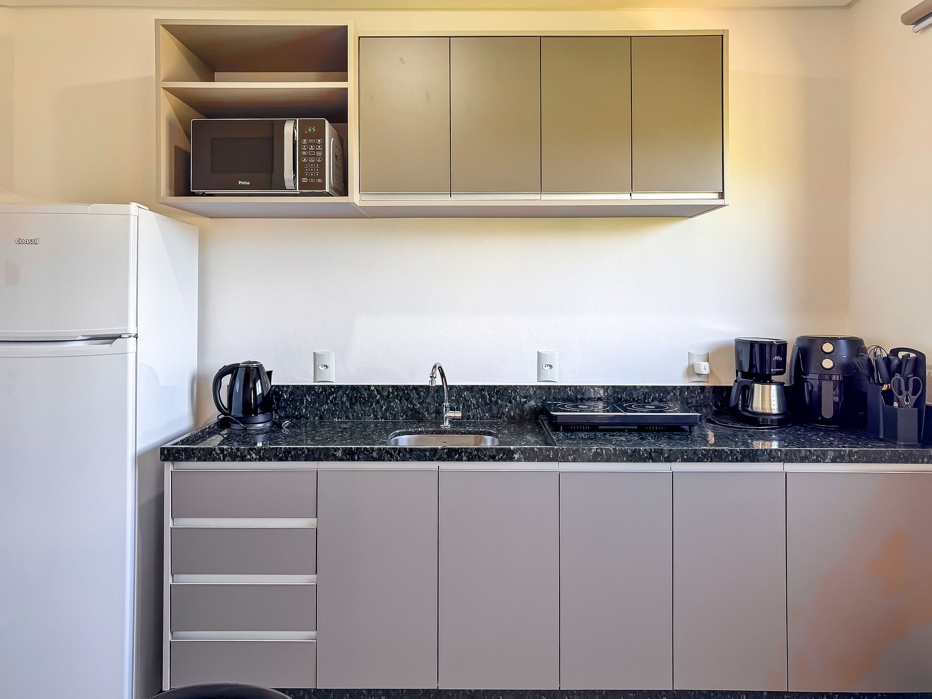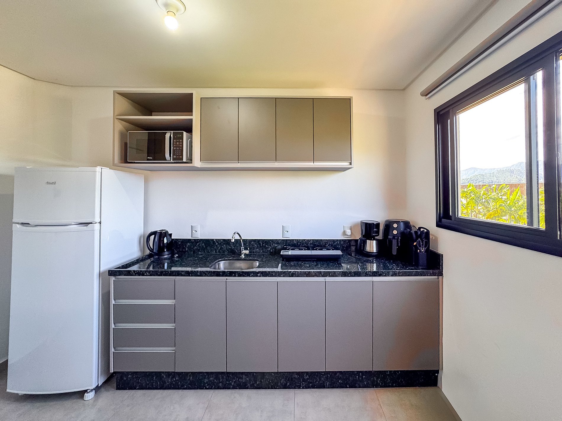 - Cozinha completa equipada com Geladeira, cooktop, micro-ondas, cafeteira, air fryer e utensílios
