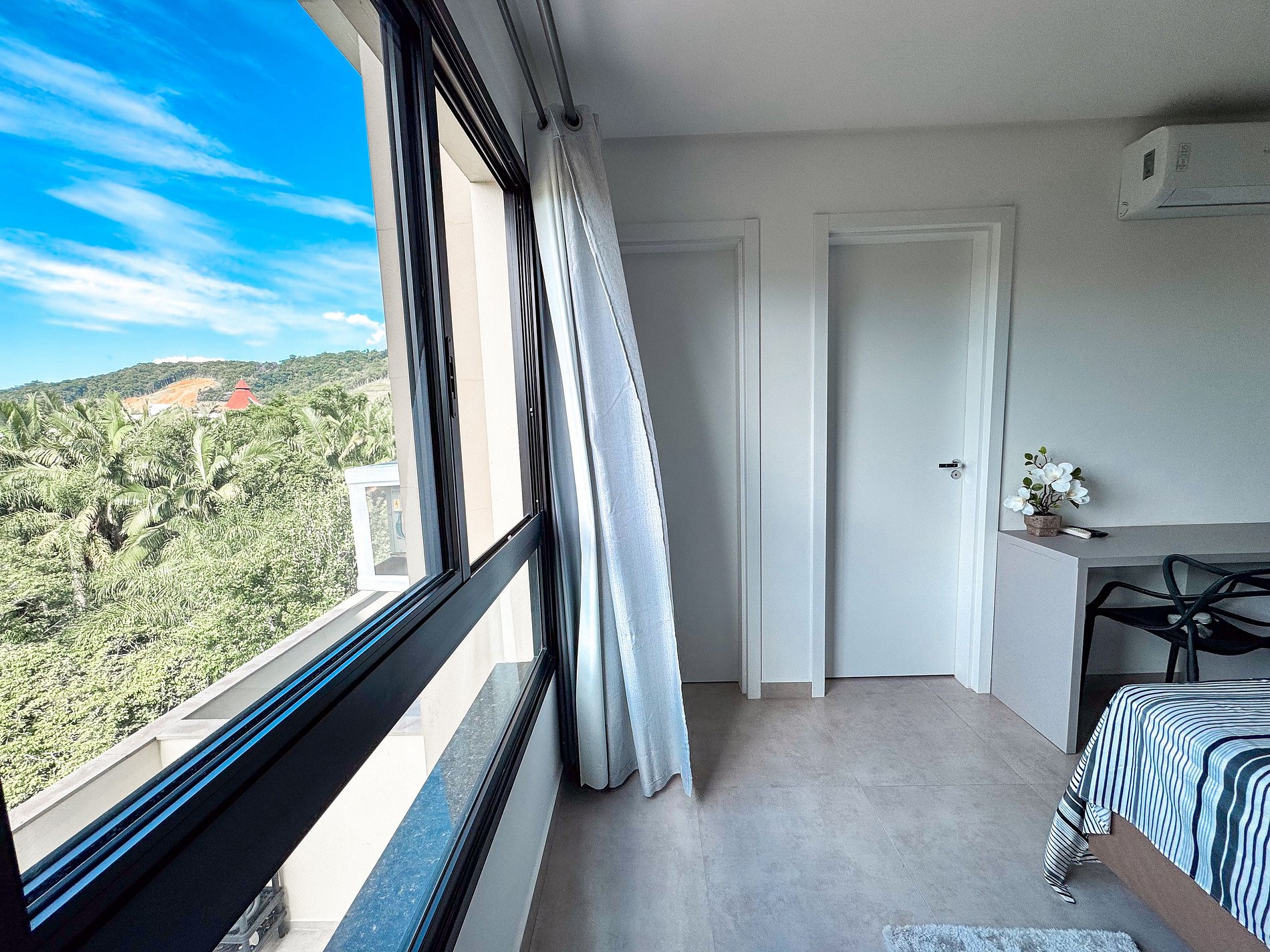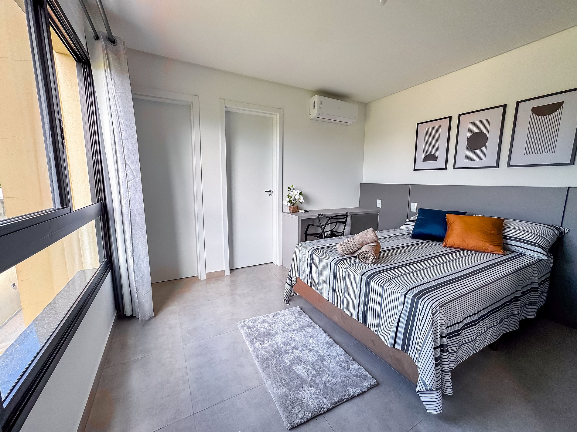 O espaço conta com cama de casal, ar-condicionado, mesa para home office, Wi-Fi, Smart TV e cozinha completa equipada, além de roupa de cama e banho. O prédio oferece piscina, coworking e ótima localização, com mercados, farmácias e restaurantes a poucos minutos a pé.