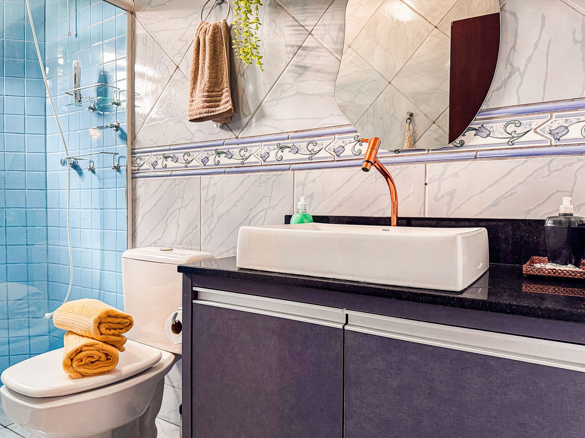Banheiros: A casa possui dois banheiros completos com chuveiros, um dentro de casa, e outro na área de festas.