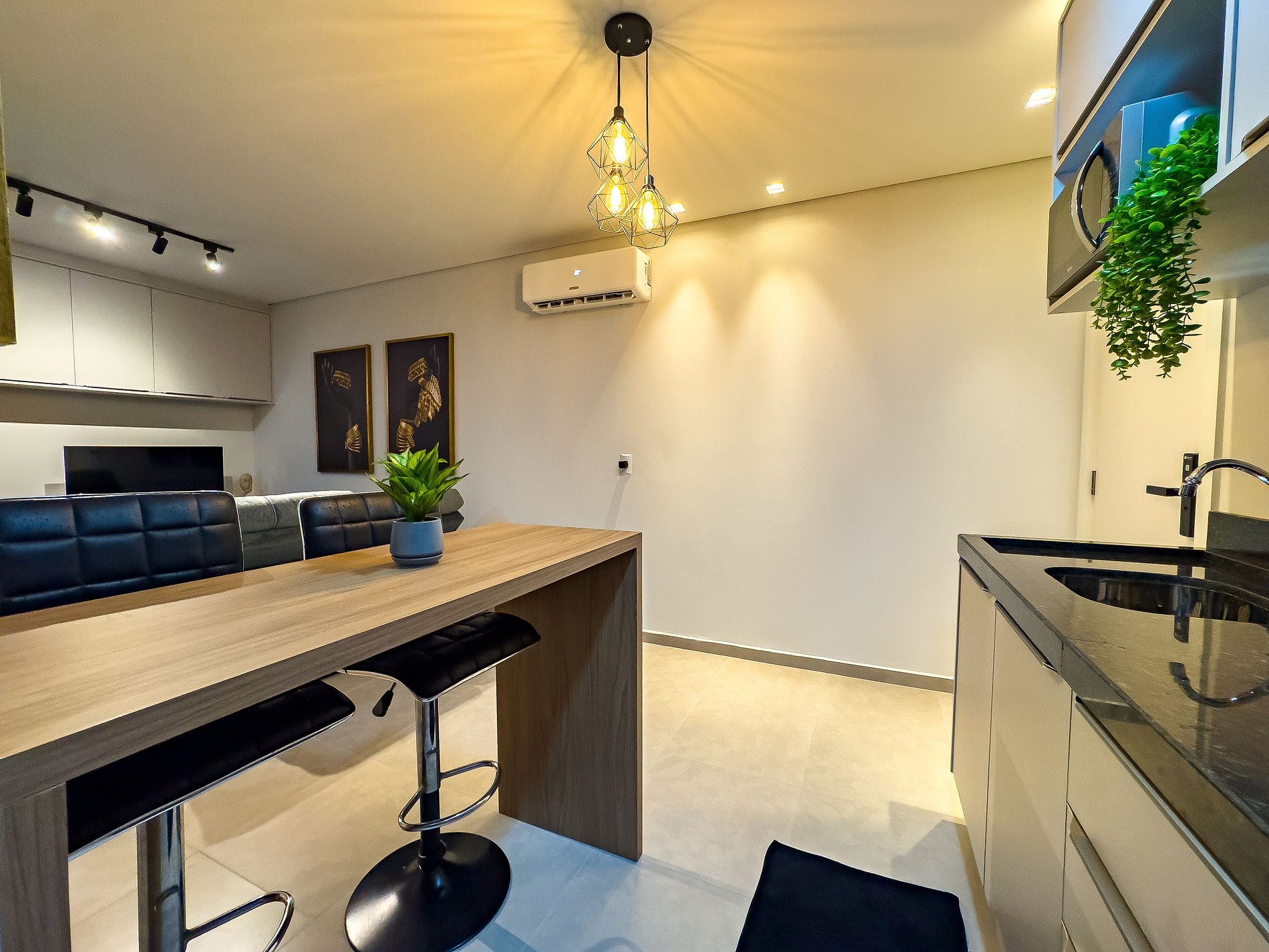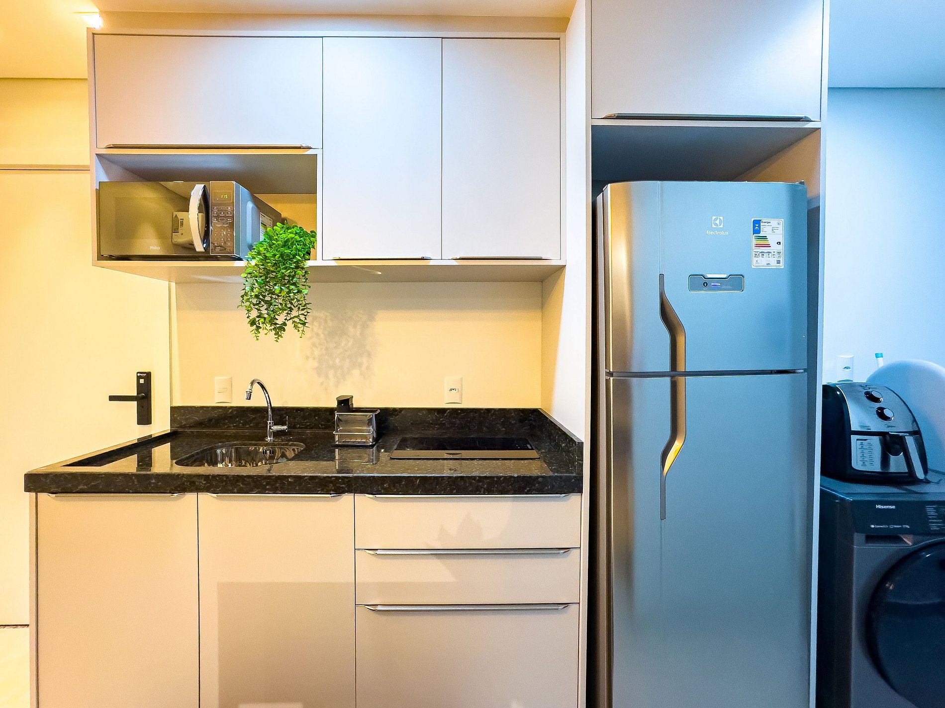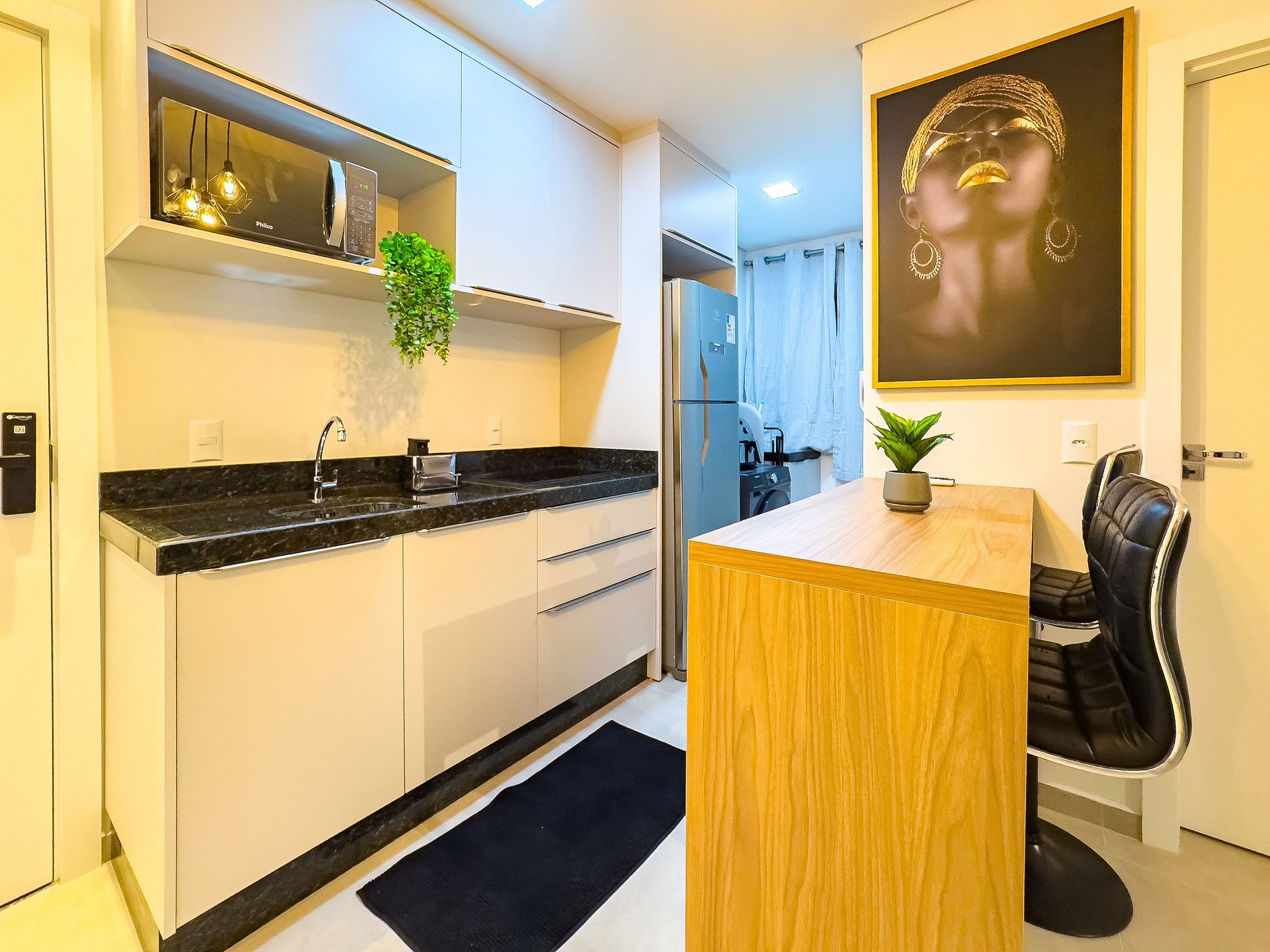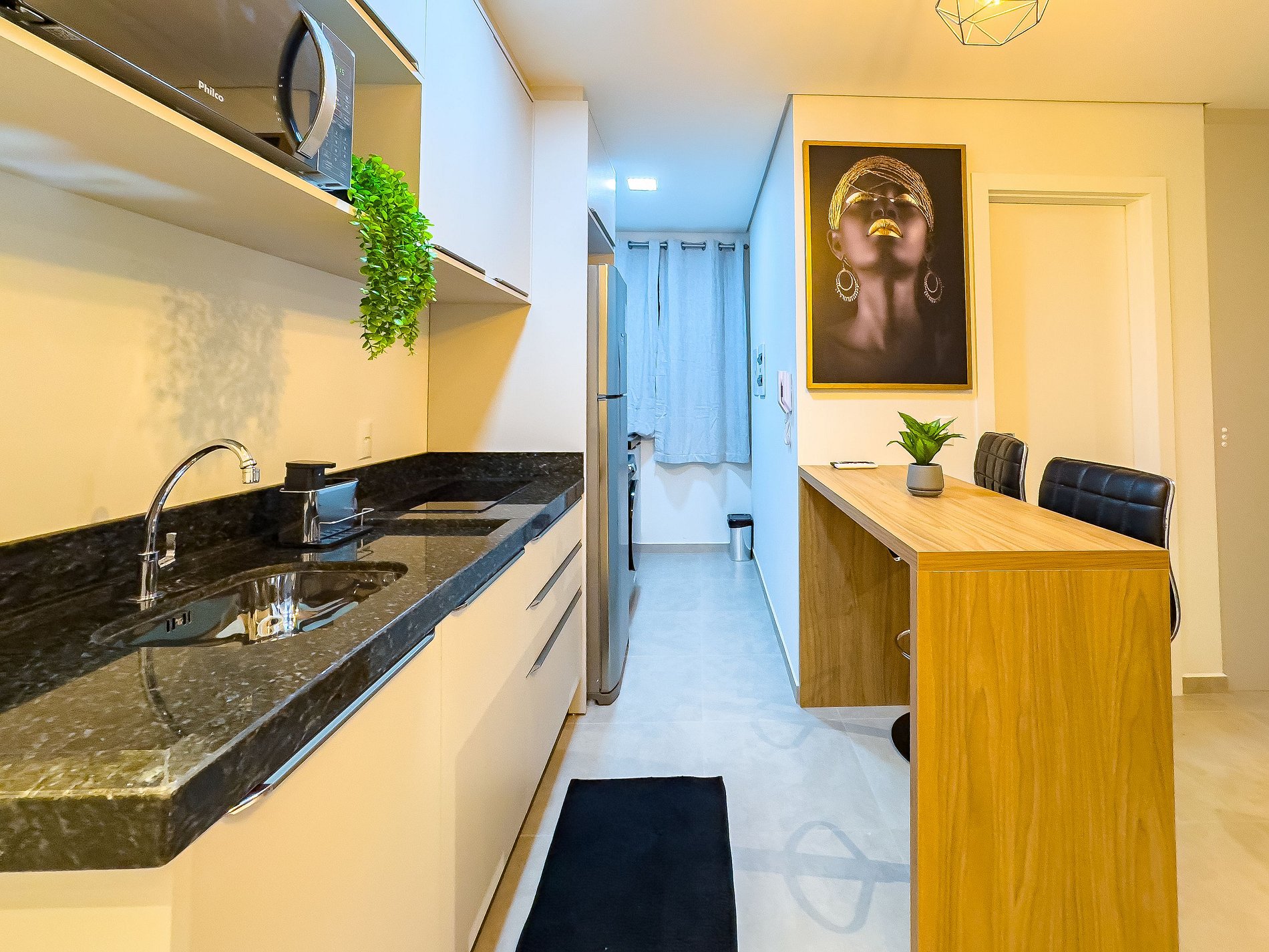 A cozinha é totalmente equipada, ideal para preparar refeições, com fogão de indução, geladeira, micro-ondas e utensílios.