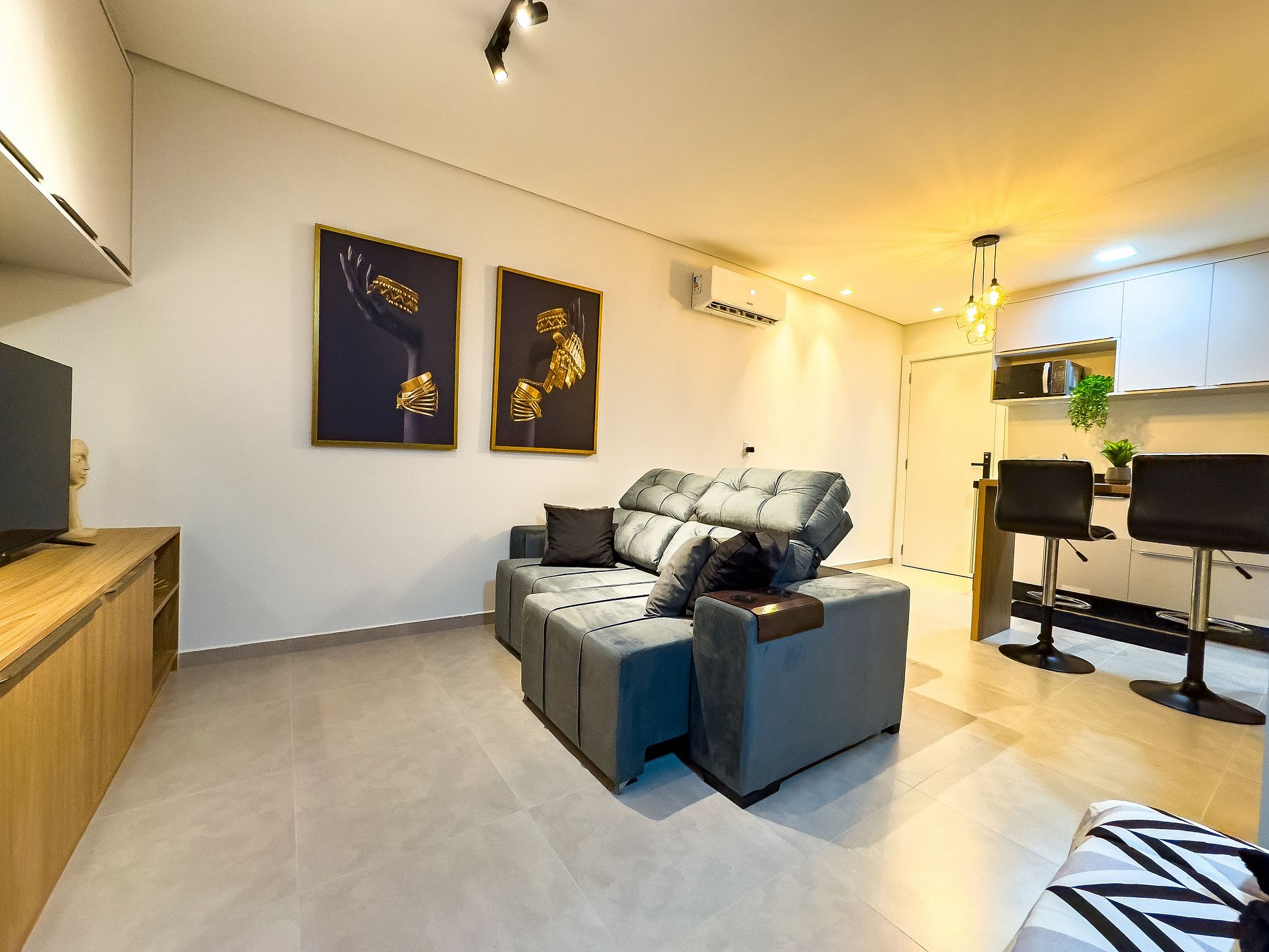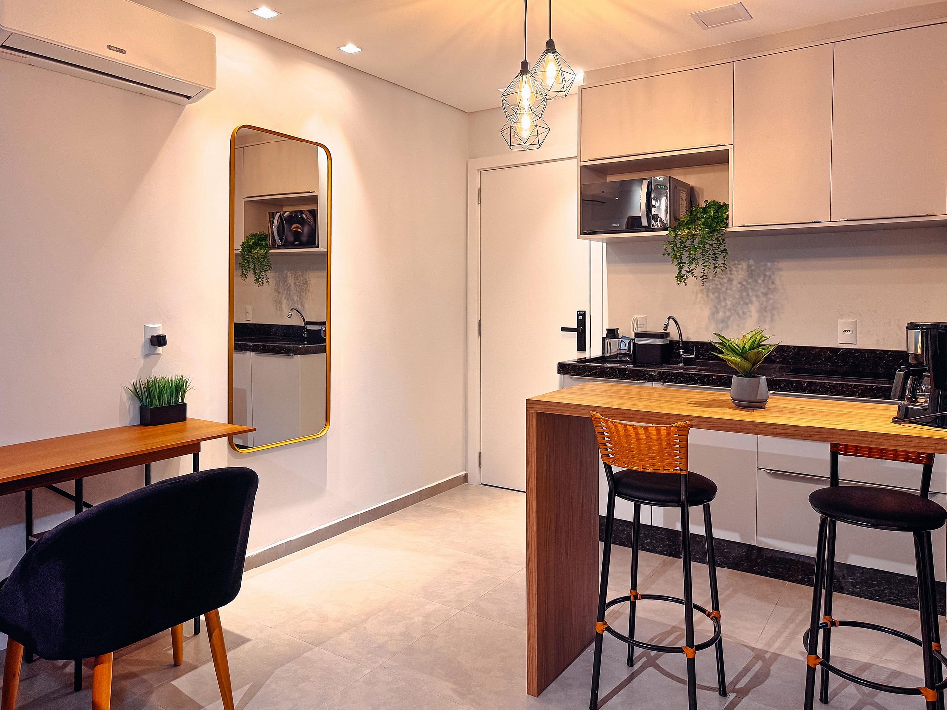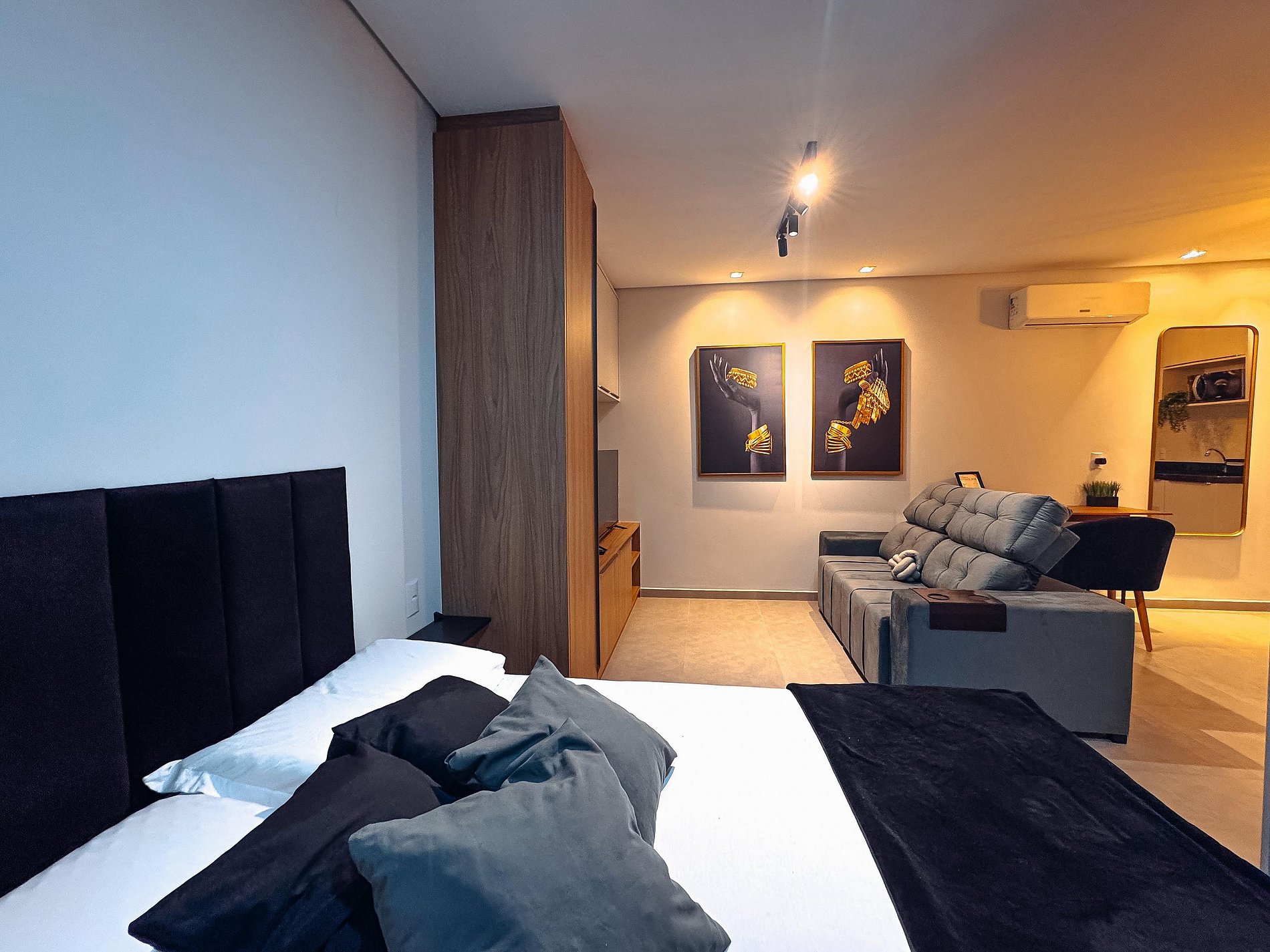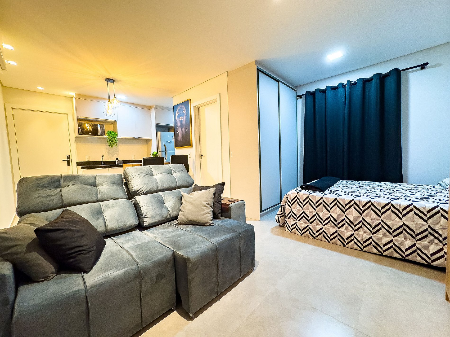 O flat possui um ambiente integrado, ambiente climatizado (ar frio), com sala de TV (dispõe de apps de streamings que o hospede pode conectar sua conta), lavanderia com lava e seca, cozinha completa e quarto com cama de casal.
