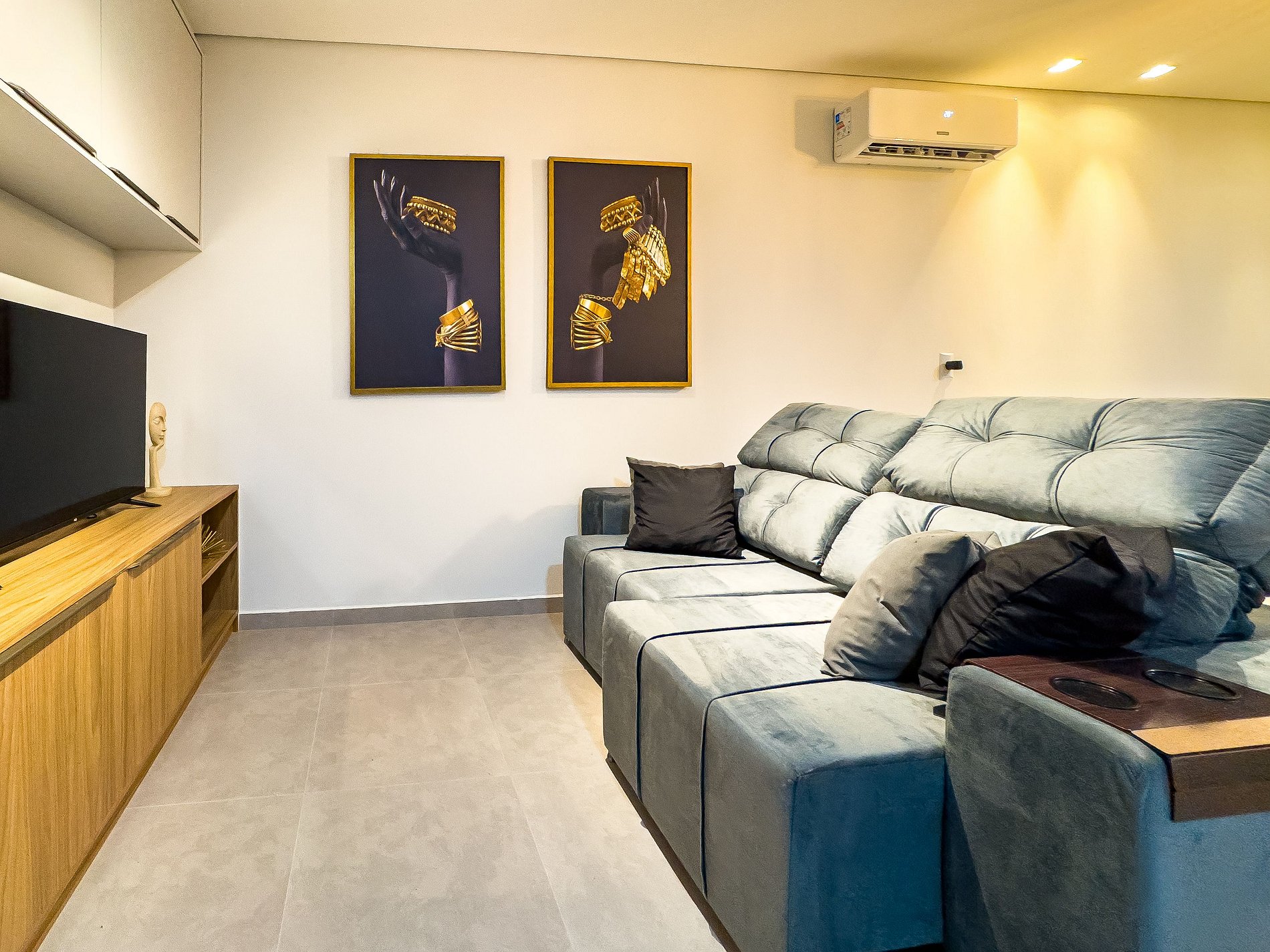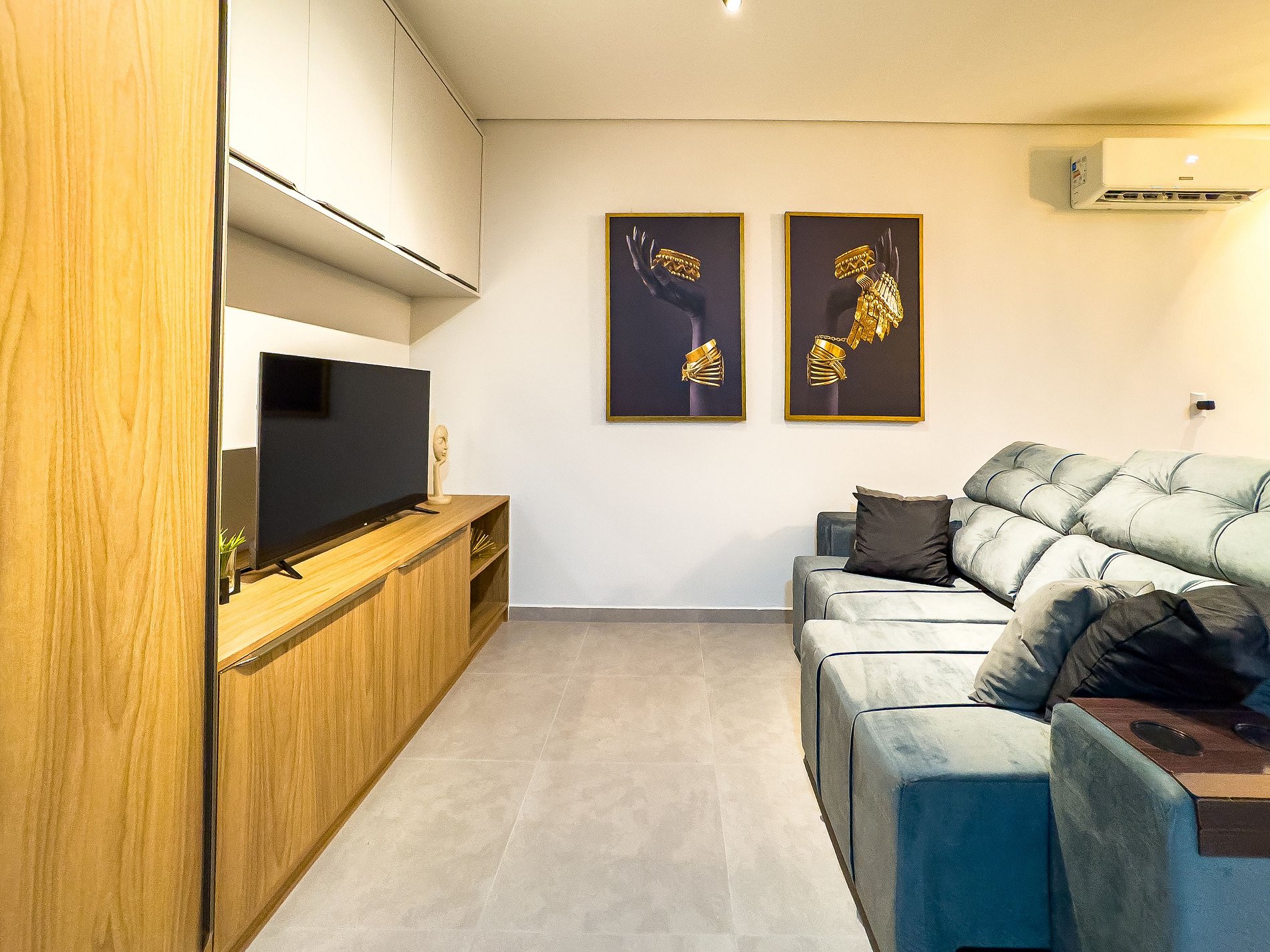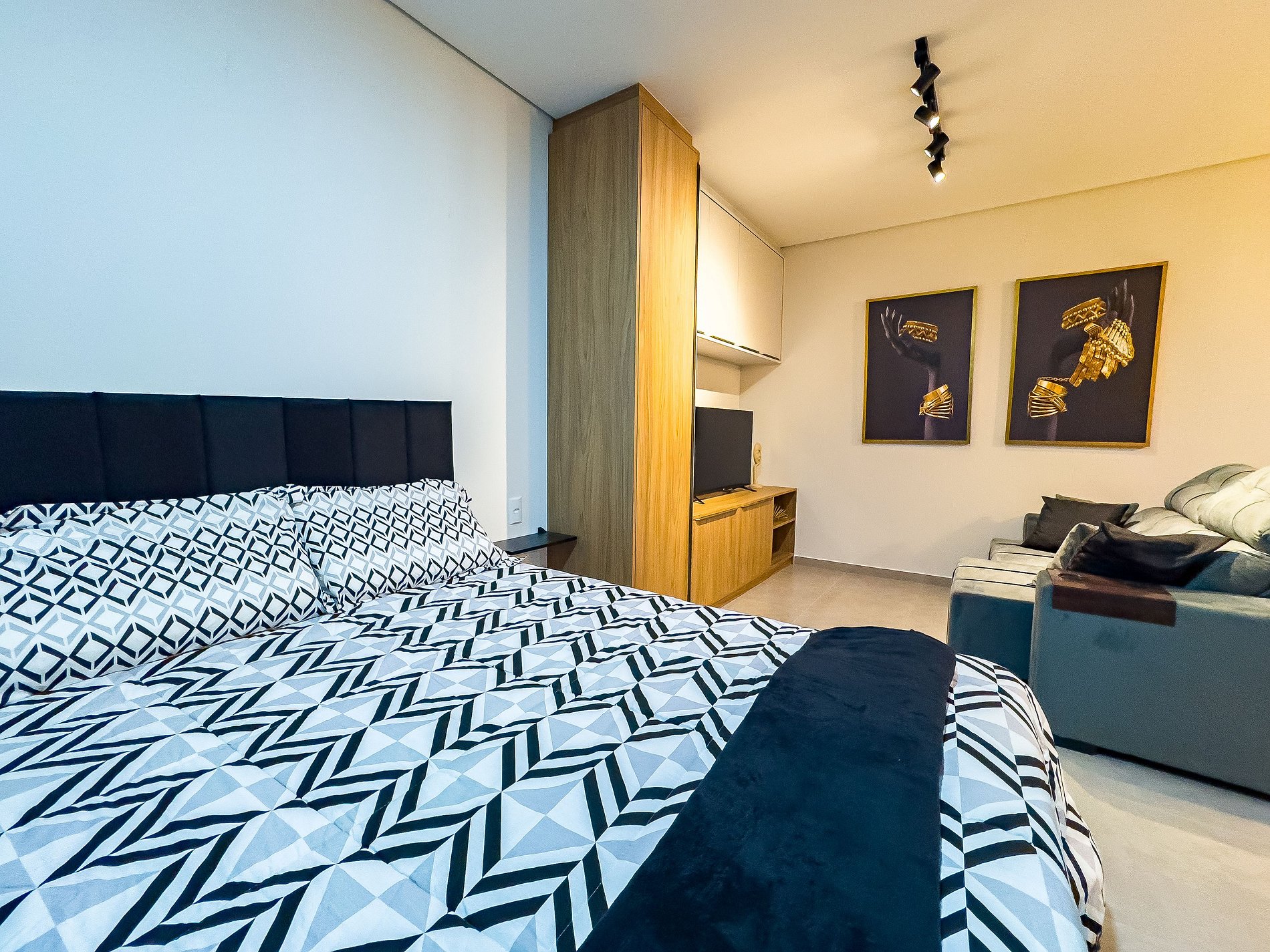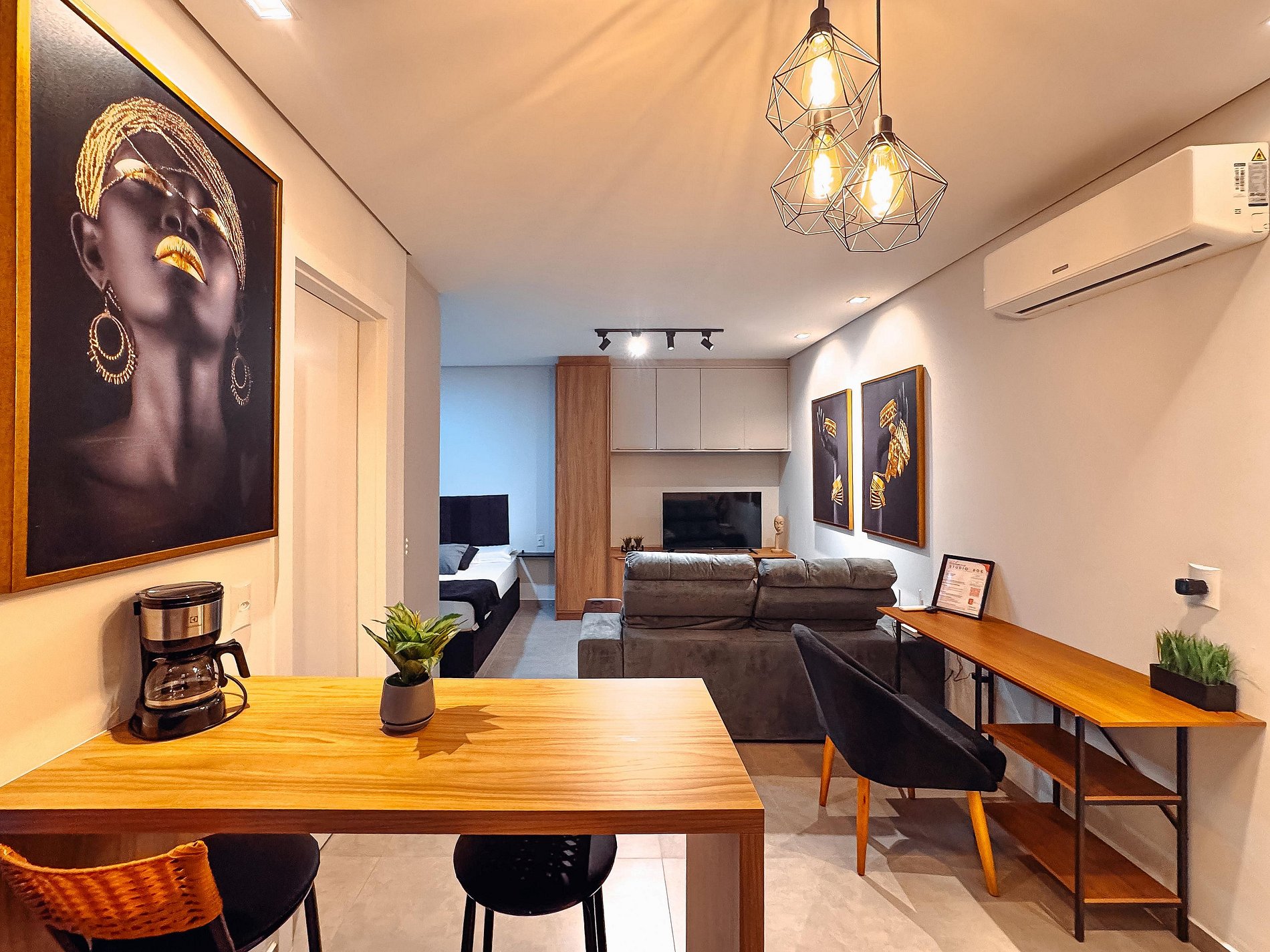 O flat possui um ambiente integrado, ambiente climatizado (ar frio), com sala de TV (dispõe de apps de streamings que o hospede pode conectar sua conta), lavanderia com lava e seca, cozinha completa e quarto com cama de casal.