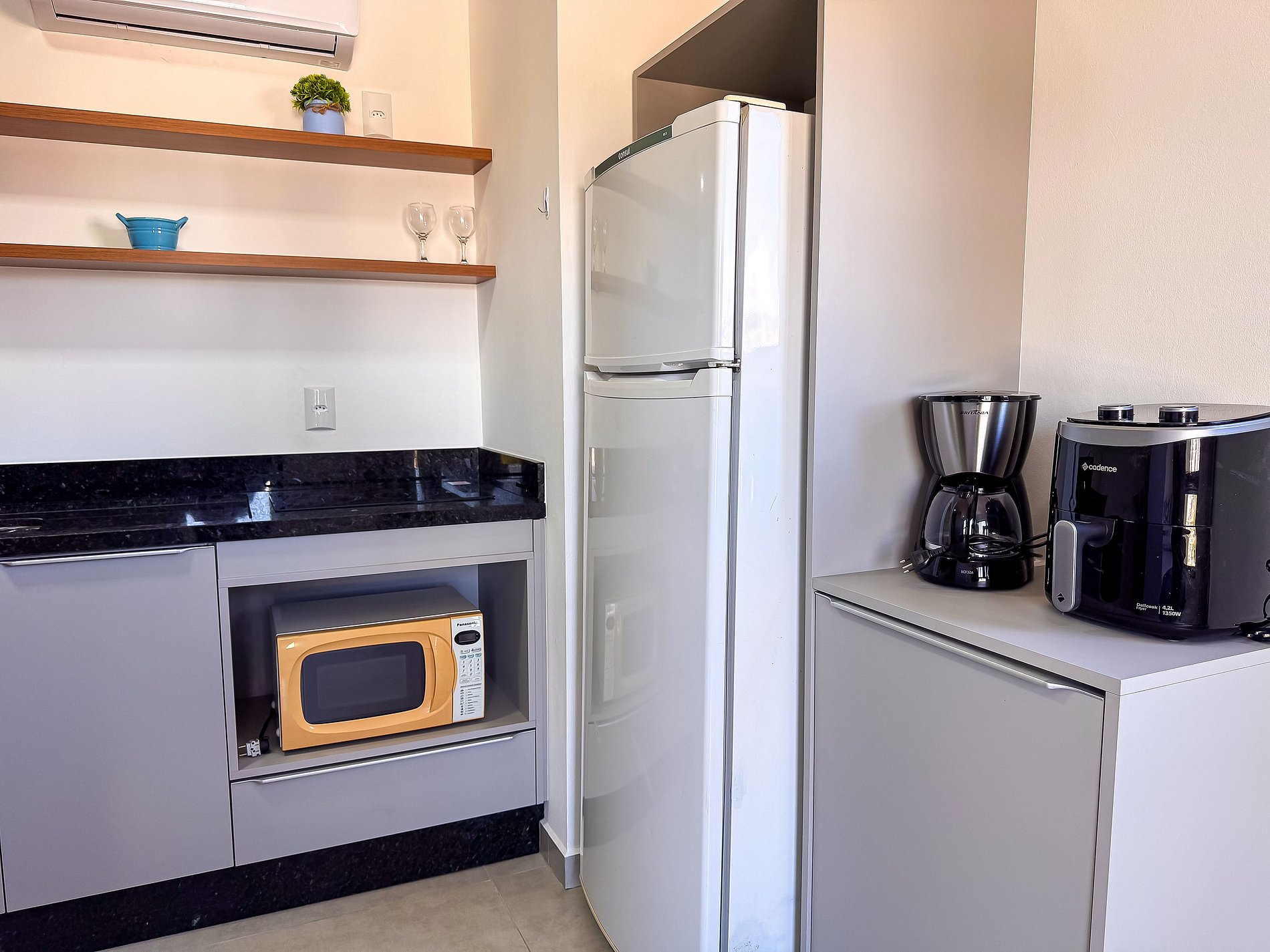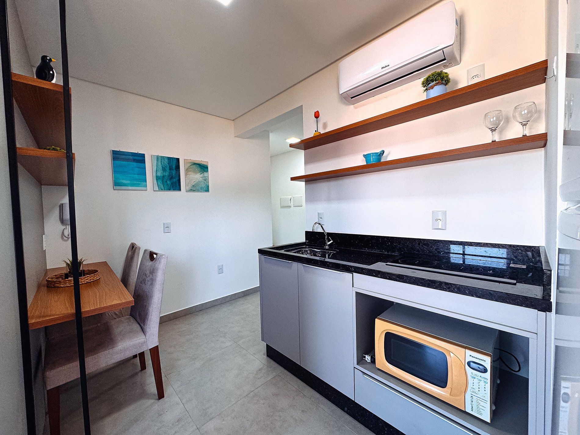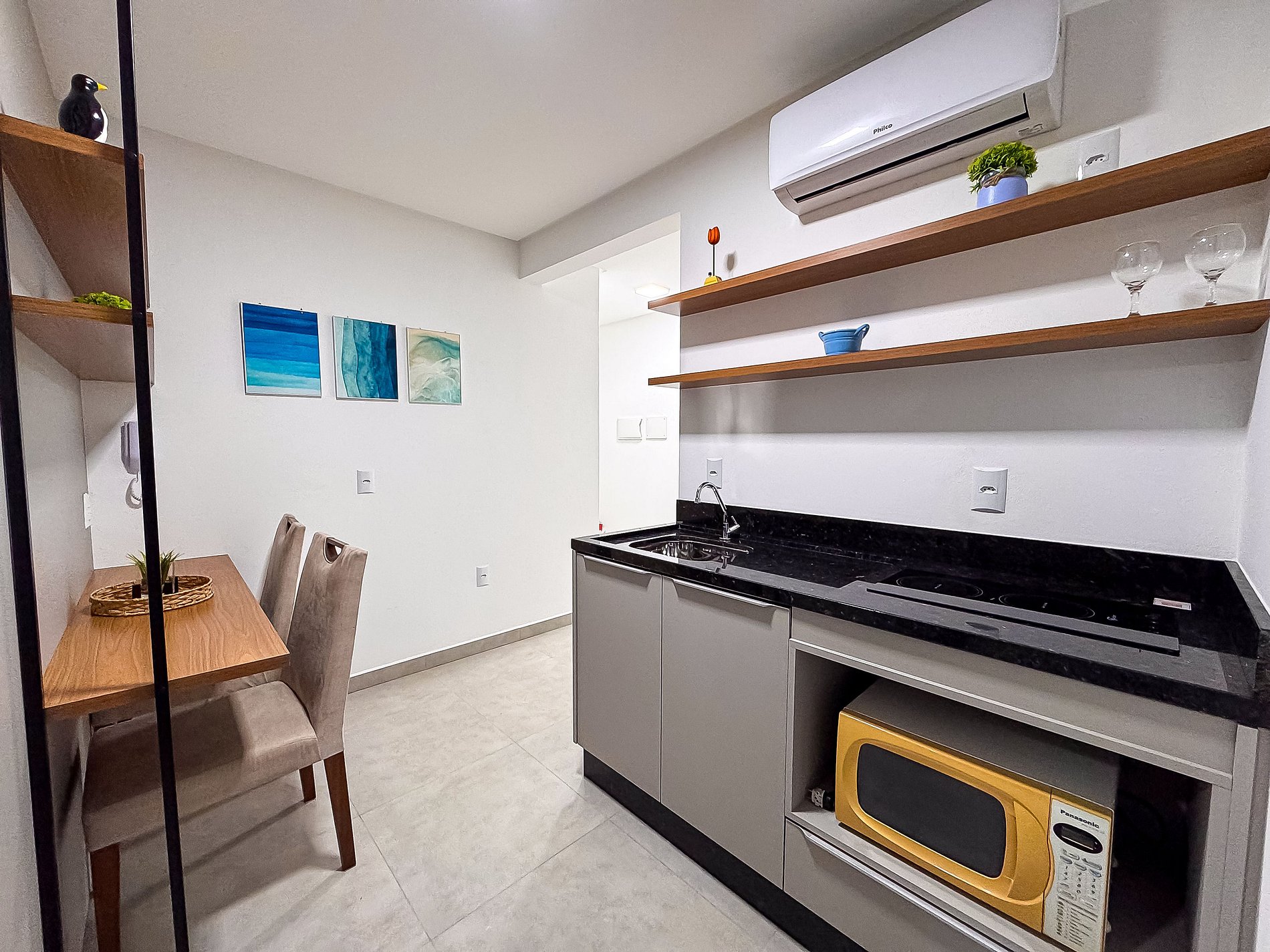 Aqui você encontra uma cozinha totalmente equipada com cooktop, micro-ondas, geladeira, panelas, louças, talheres, cafeteira e todos os utensílios para preparar suas refeições como se estivesse em casa.