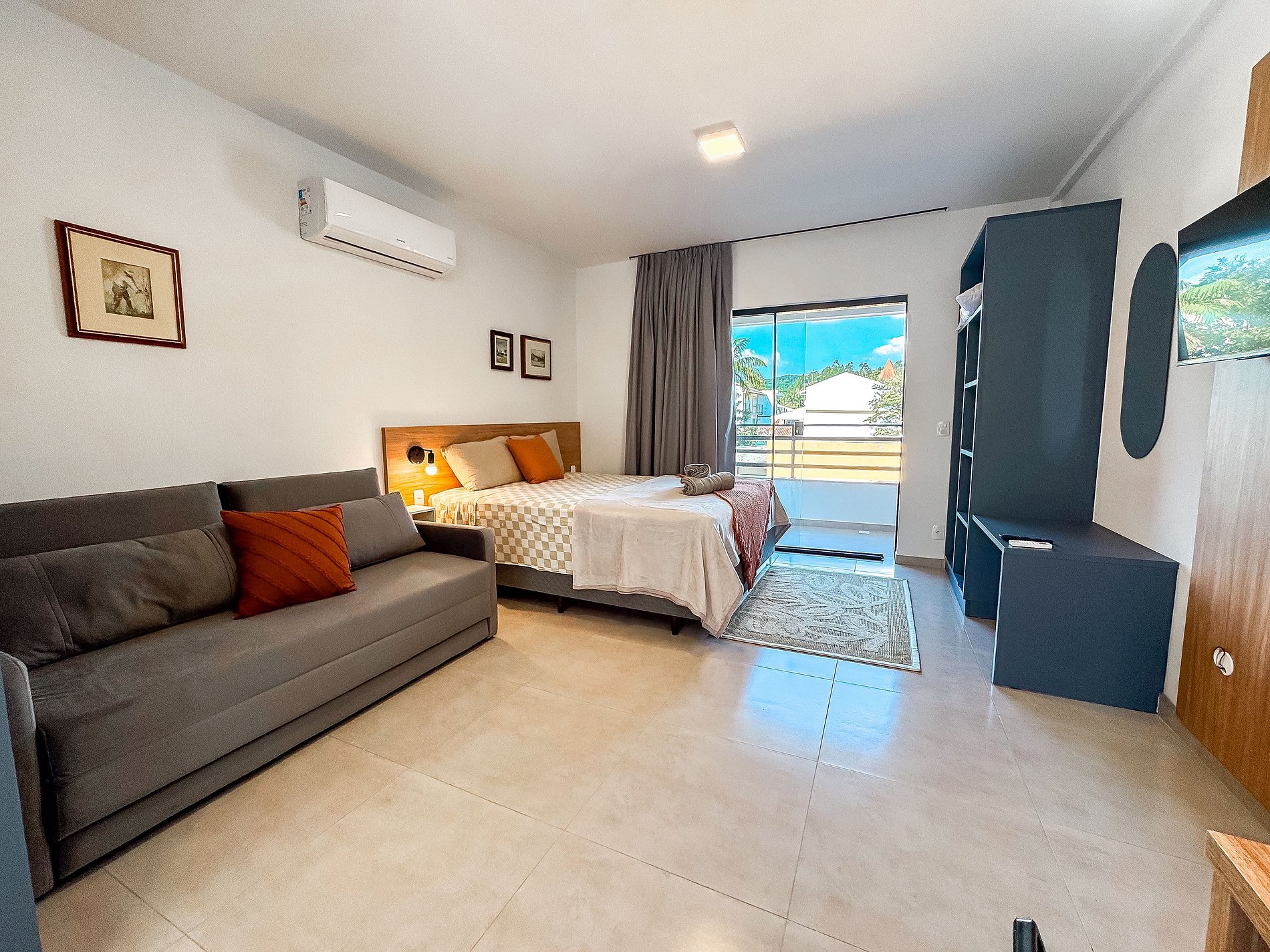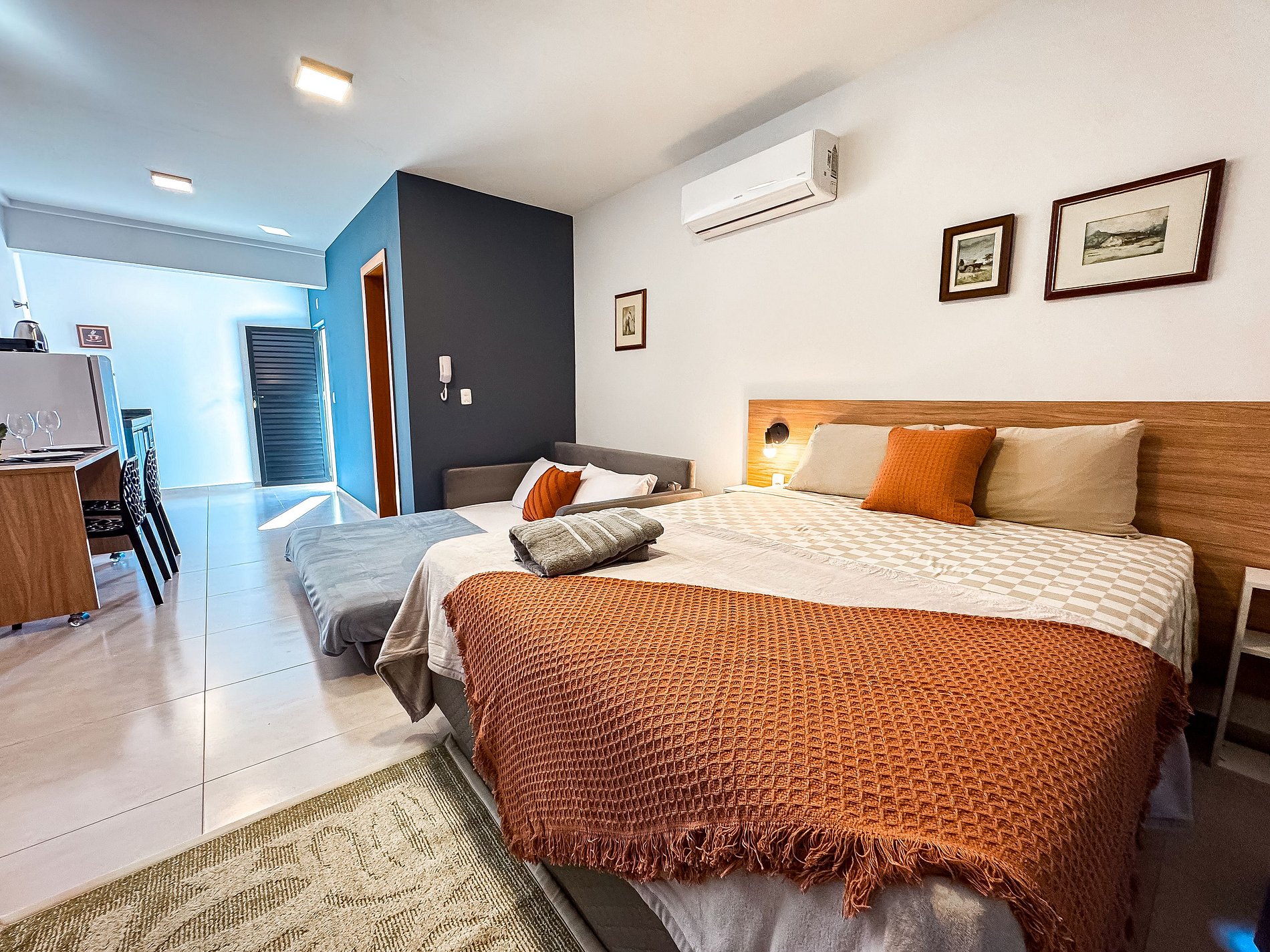 Studio moderno e completo no coração de Brusque, ideal para até 4 hóspedes. Conta com cama queen, sofá-cama, ar-condicionado, cozinha equipada, Wi-Fi e vaga de garagem. Ambiente integrado, bem decorado e confortável, com roupas de cama e banho de qualidade. Localização central, próxima a comércios, lojas e restaurantes, perfeita para quem busca praticidade e conforto.